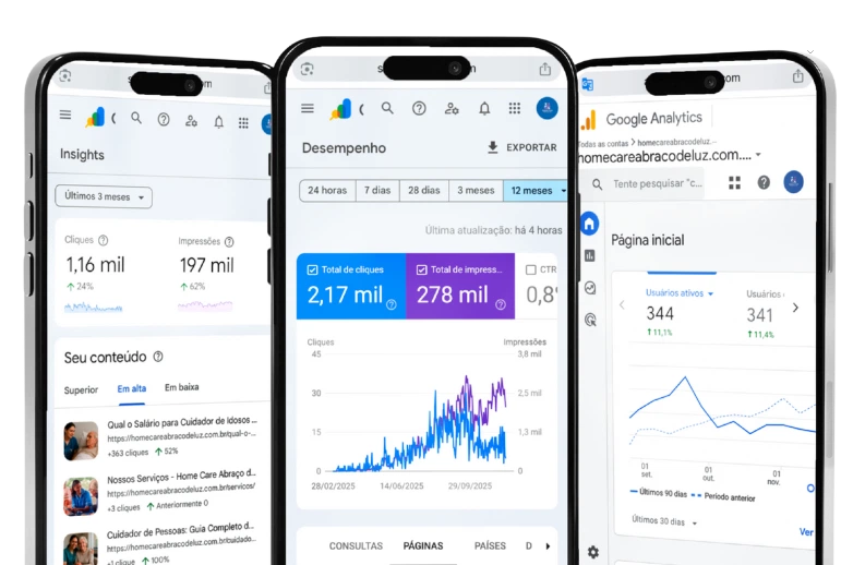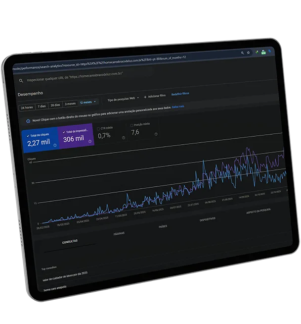 Diagnóstico completo do seu site: estrutura, velocidade e erros. Corrigimos problemas técnicos para que o Google rastreie e indexe seu conteúdo eficientemente, garantindo uma base sólida para o SEO